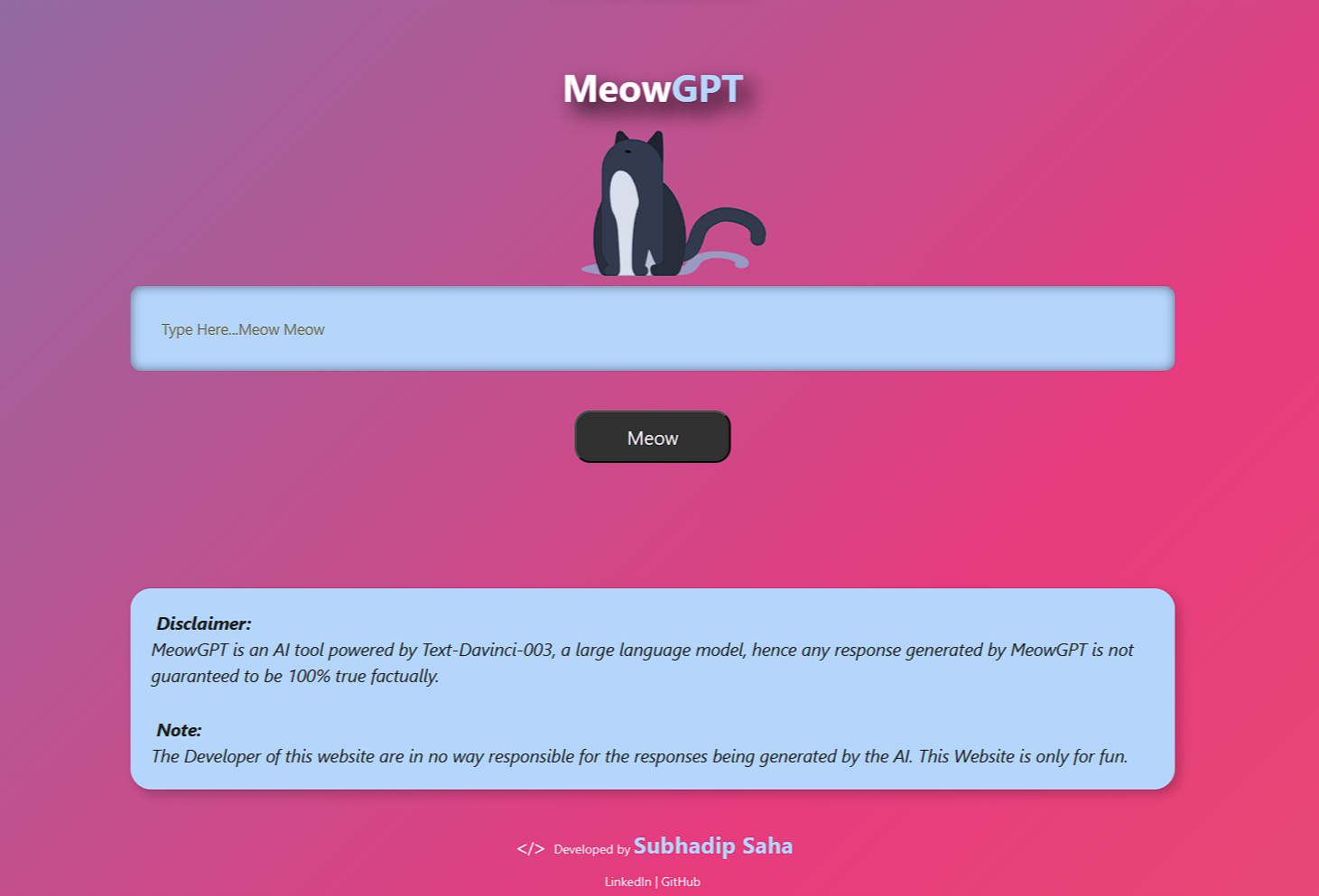 MeowGPT is a GPT based chatbot made with Flask which mimics like a cat. It is made for fun. MEOW.